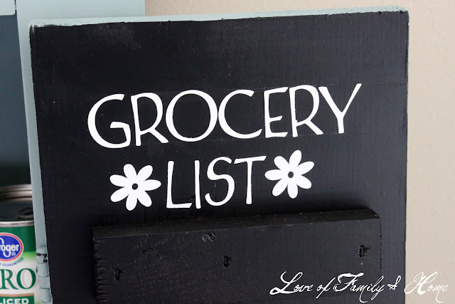 Then I came up with an idea…it would serve as a small pantry & house all of my can goods! Then I would be able to free up some space in my lazy Susan! I also had an idea to use the inside surface of the door as a chalkboard/memo board to keep track of things I needed from the store! So I painted the shelves blue on the inside of the cabinet & use chalkboard spray paint to create a